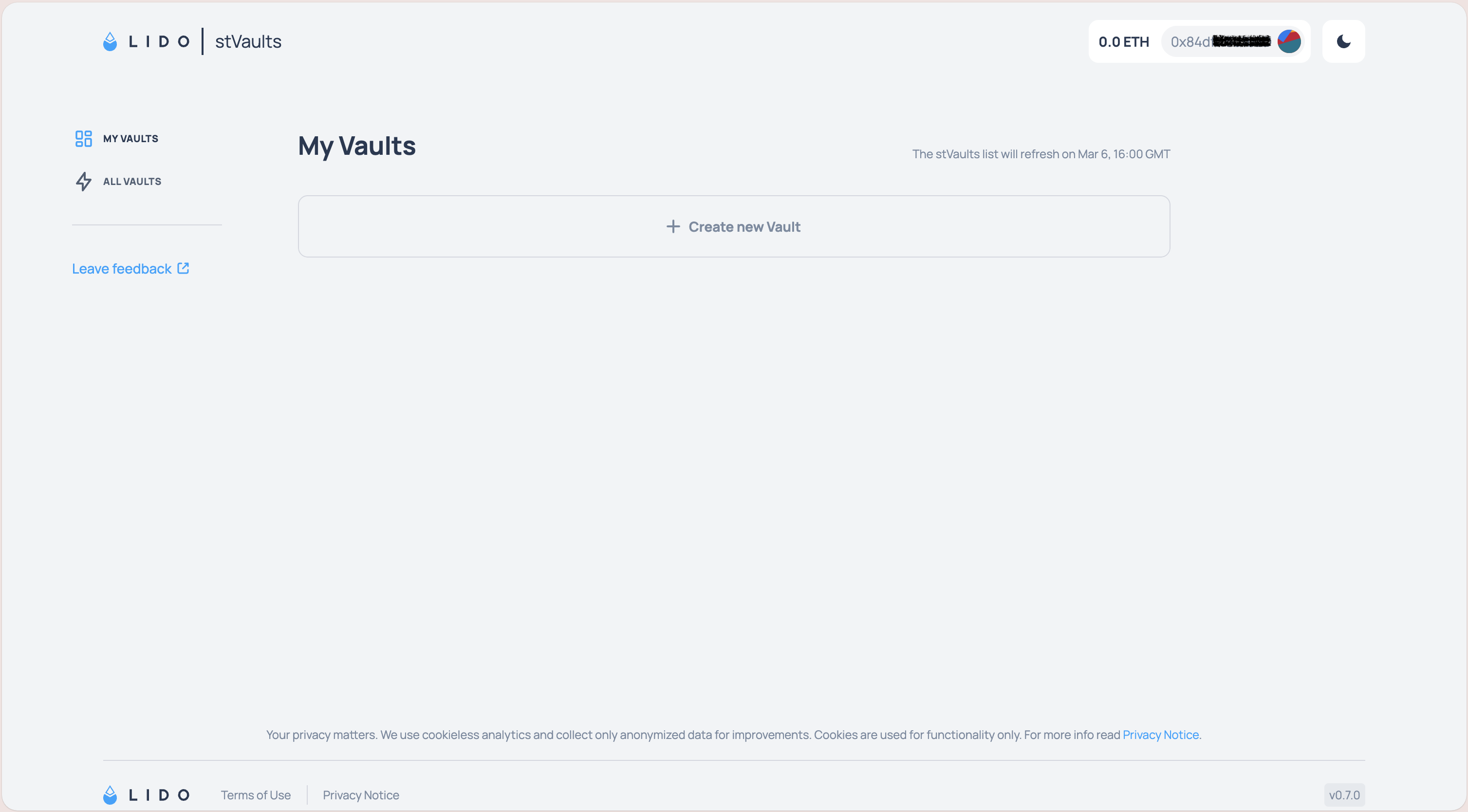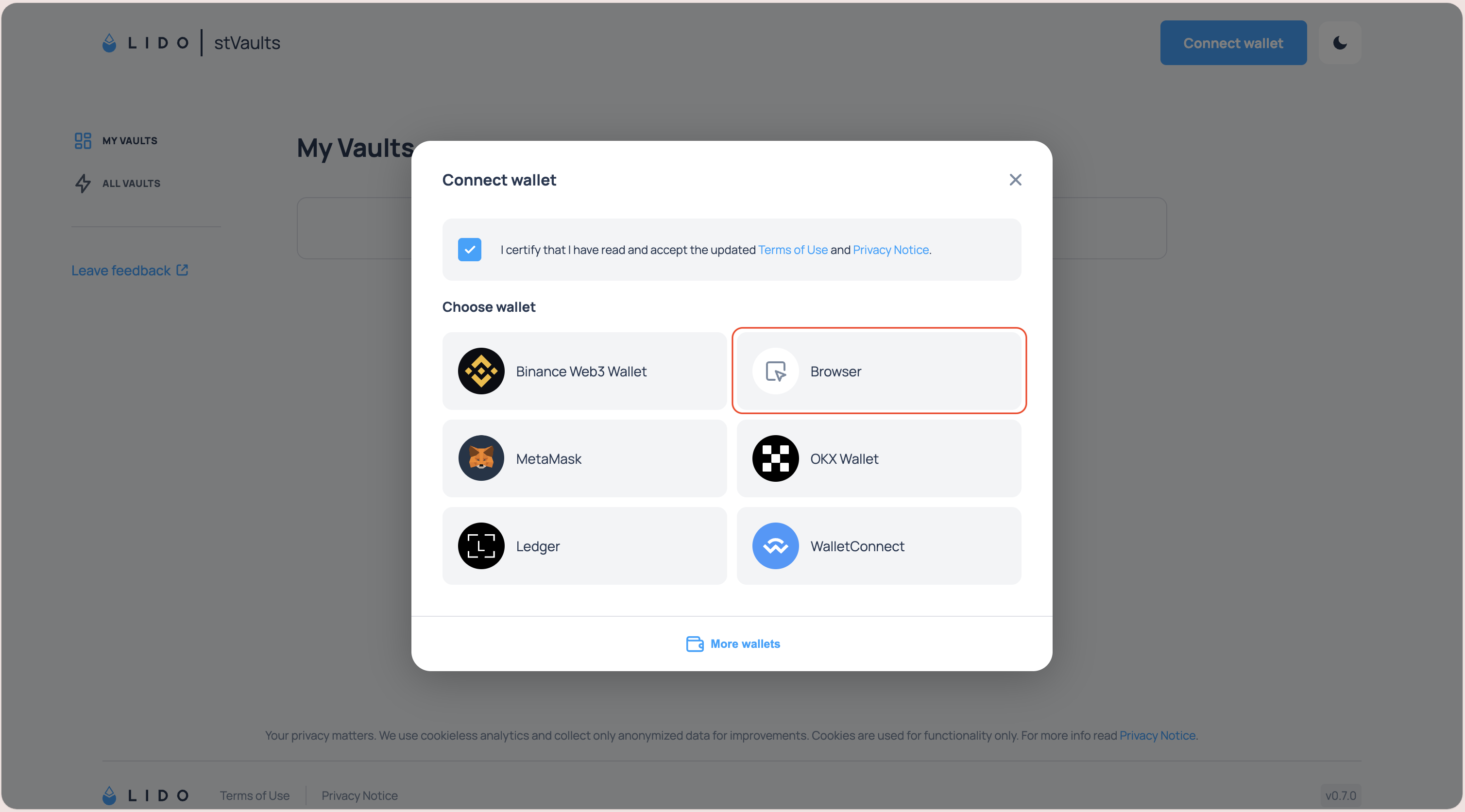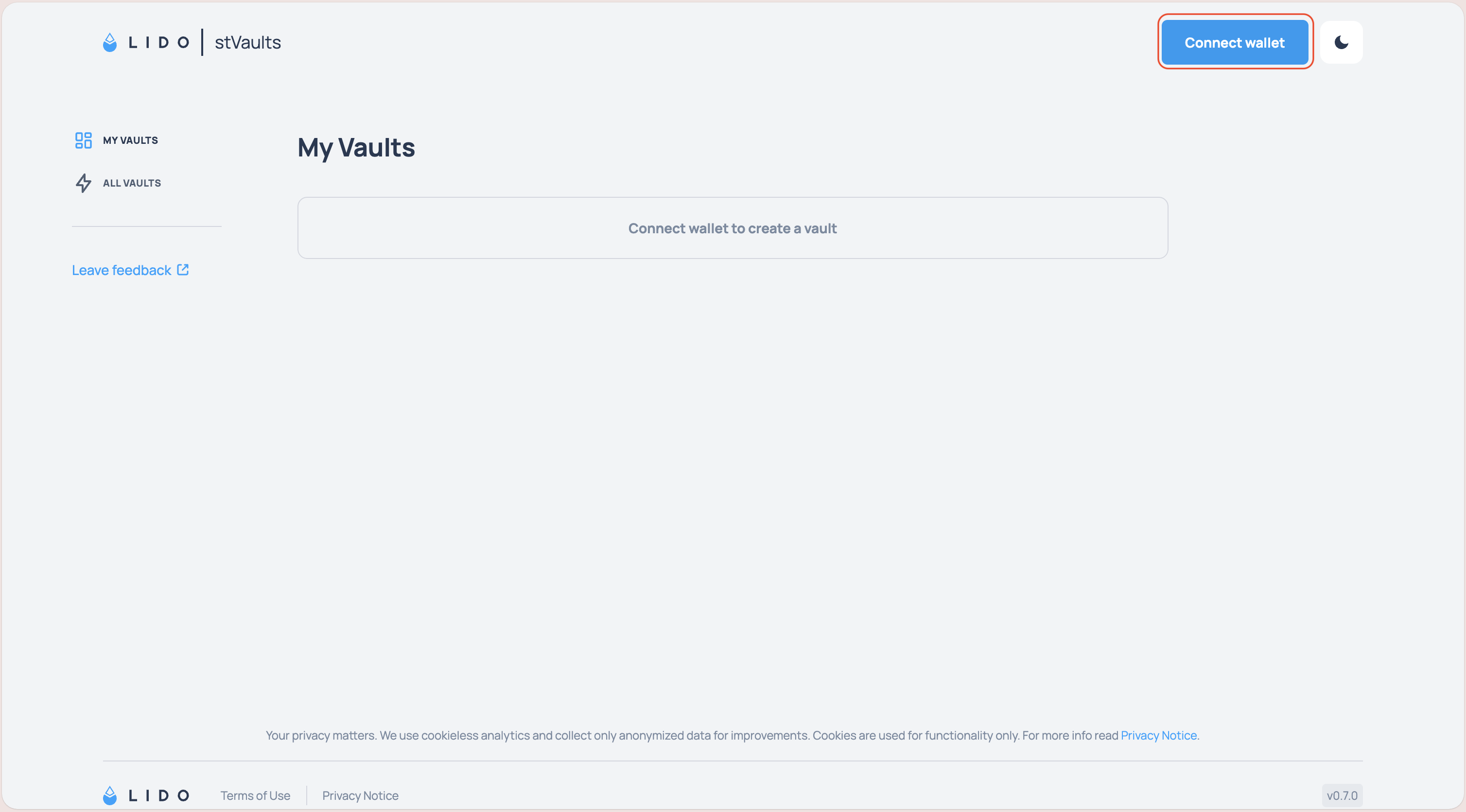 2.1 Open stVaults Web UI https://stvaults.lido.fi/ and click "Connect wallet"