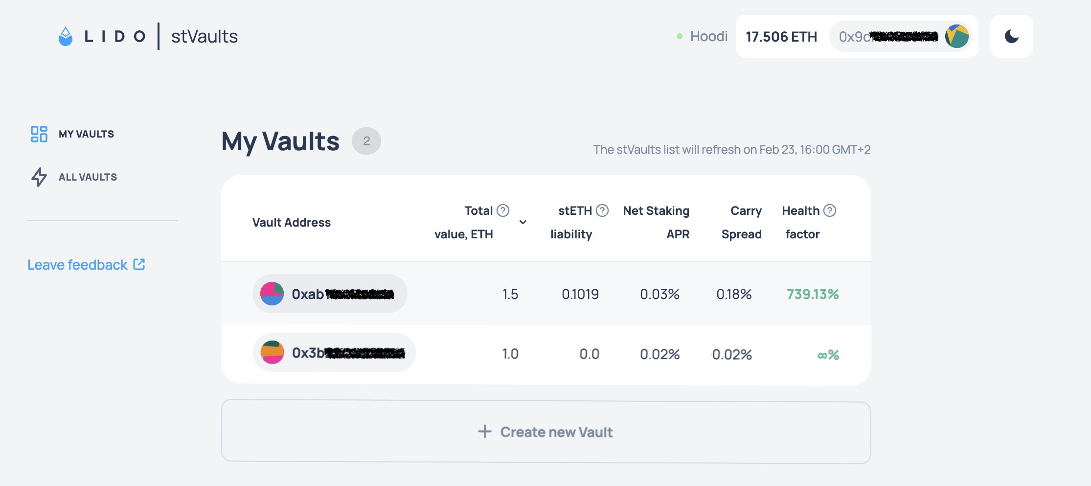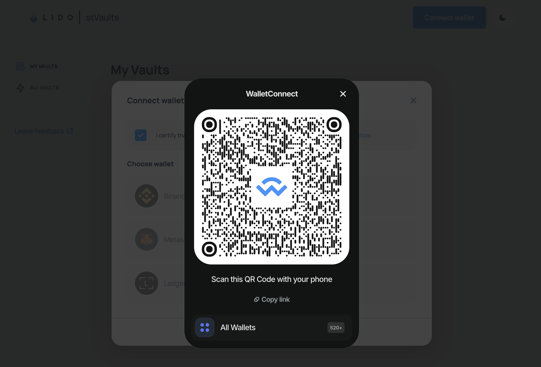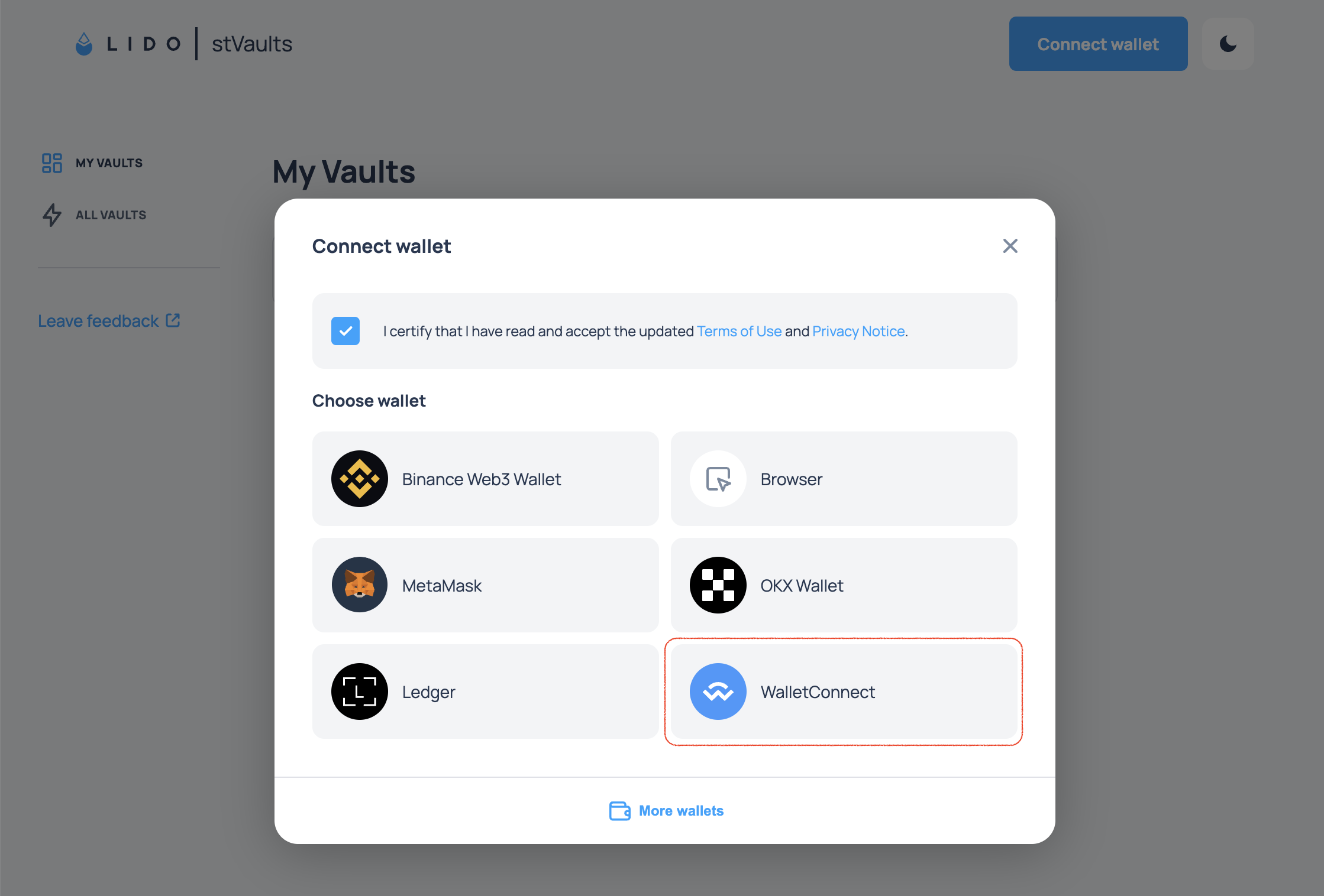 1.1. Open stVaults Web UI https://stvaults.lido.fi/ and click "Connect wallet"β