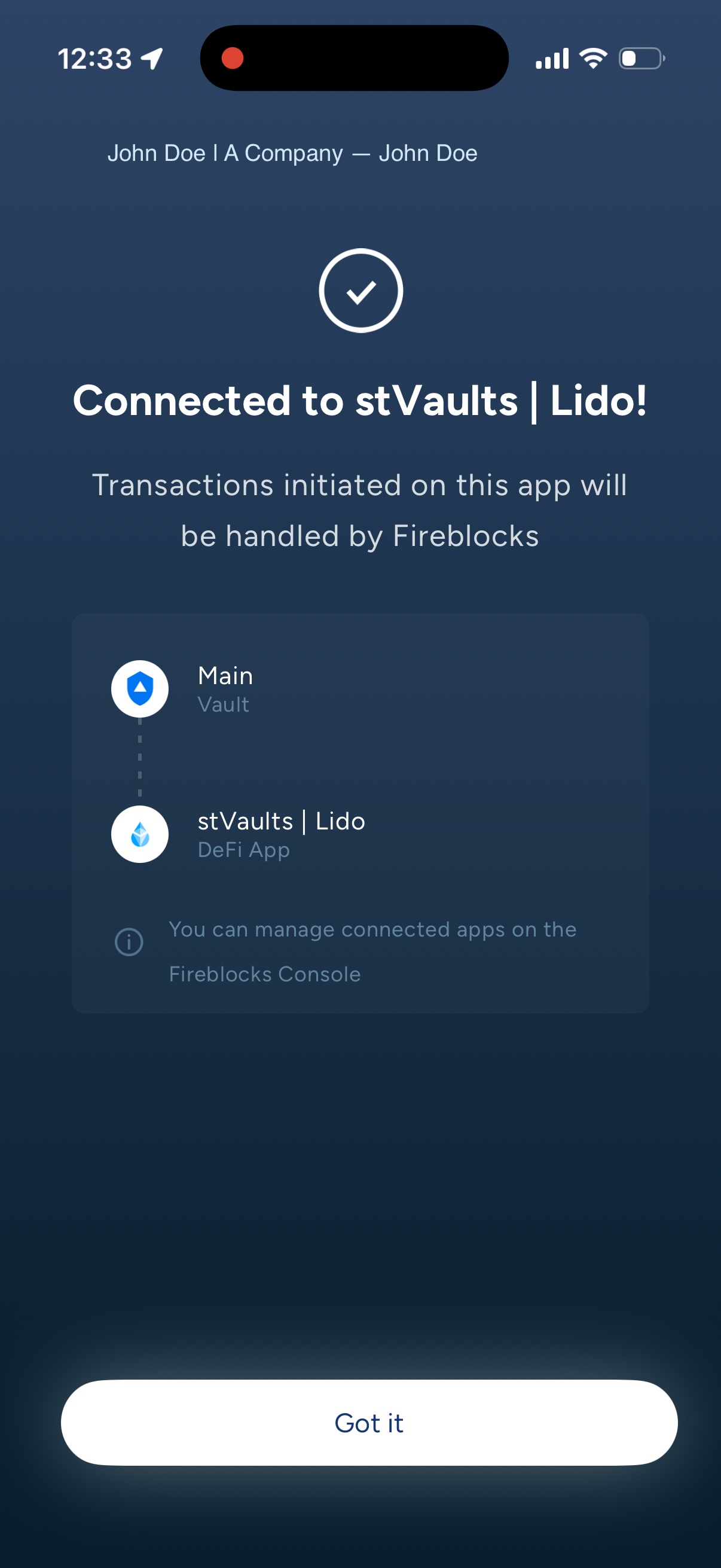 Your Fireblocks wallet address will now appear as connected, and you can create and manage stVaults.